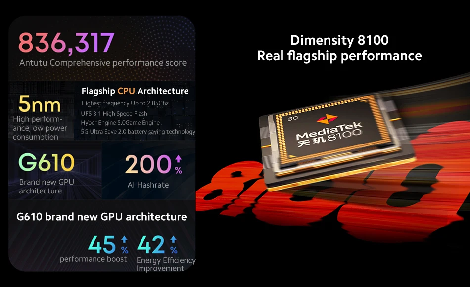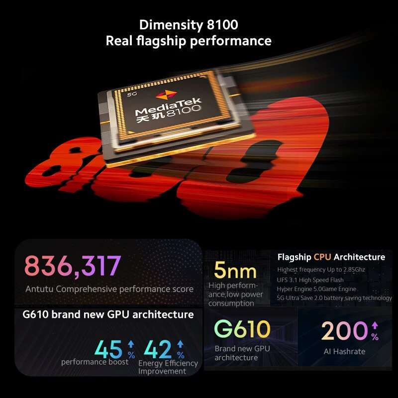 ◉CPU:Dimensity 8100, up to 2.85GHz